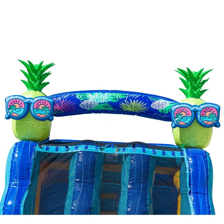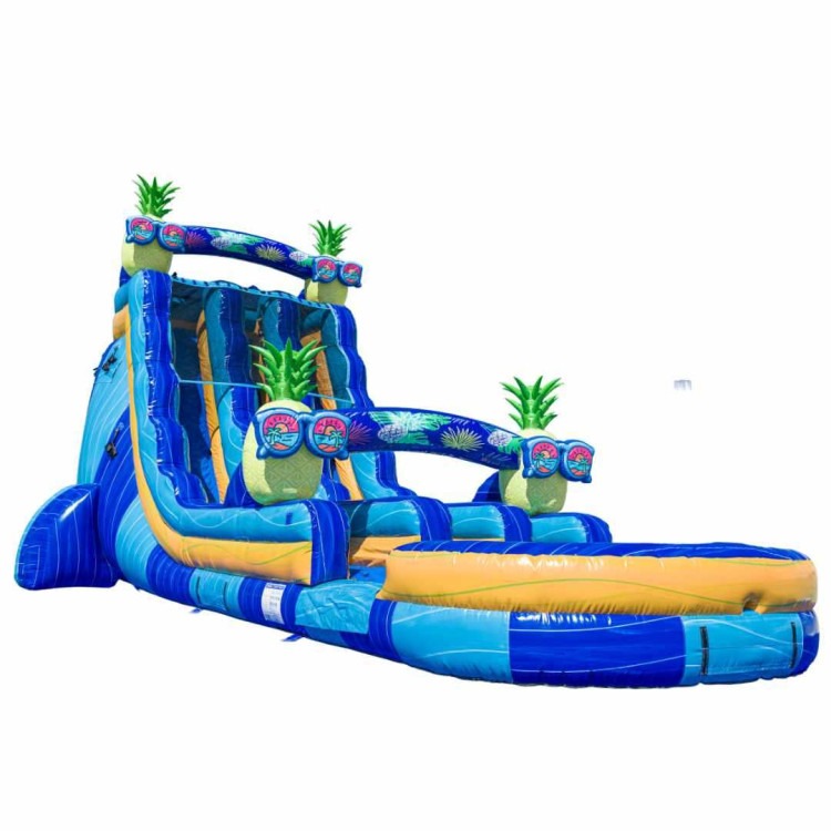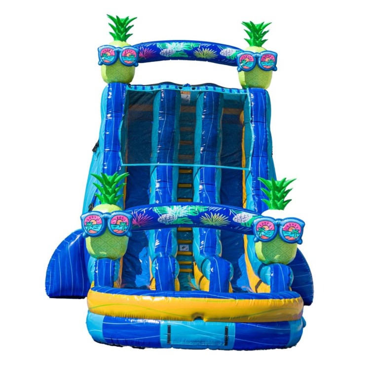 - Take your party to new heights with the 22ft DL Tropical Pineapple Paradise — a vibrant, island‑themed inflatable ideal for larger gatherings and events. This tall, double‑lane unit features bright tropical pineapple accents and roomy lanes that let guests slide side‑by‑side for fast, friendly competition. With a 22‑foot height, it delivers an impressive visual centerpiece and a thrilling descent that’s exciting for teens and adults as well as older kids. Built for rentals, it’s engineered for quick setup and takedown, durable for repeated use, and easy for your crew to position on grass, pavement, or a hard surface with proper anchoring. Perfect for luau parties, summer get togethers, or any celebration that needs a splash of island fun and big‑time sliding excitement.
